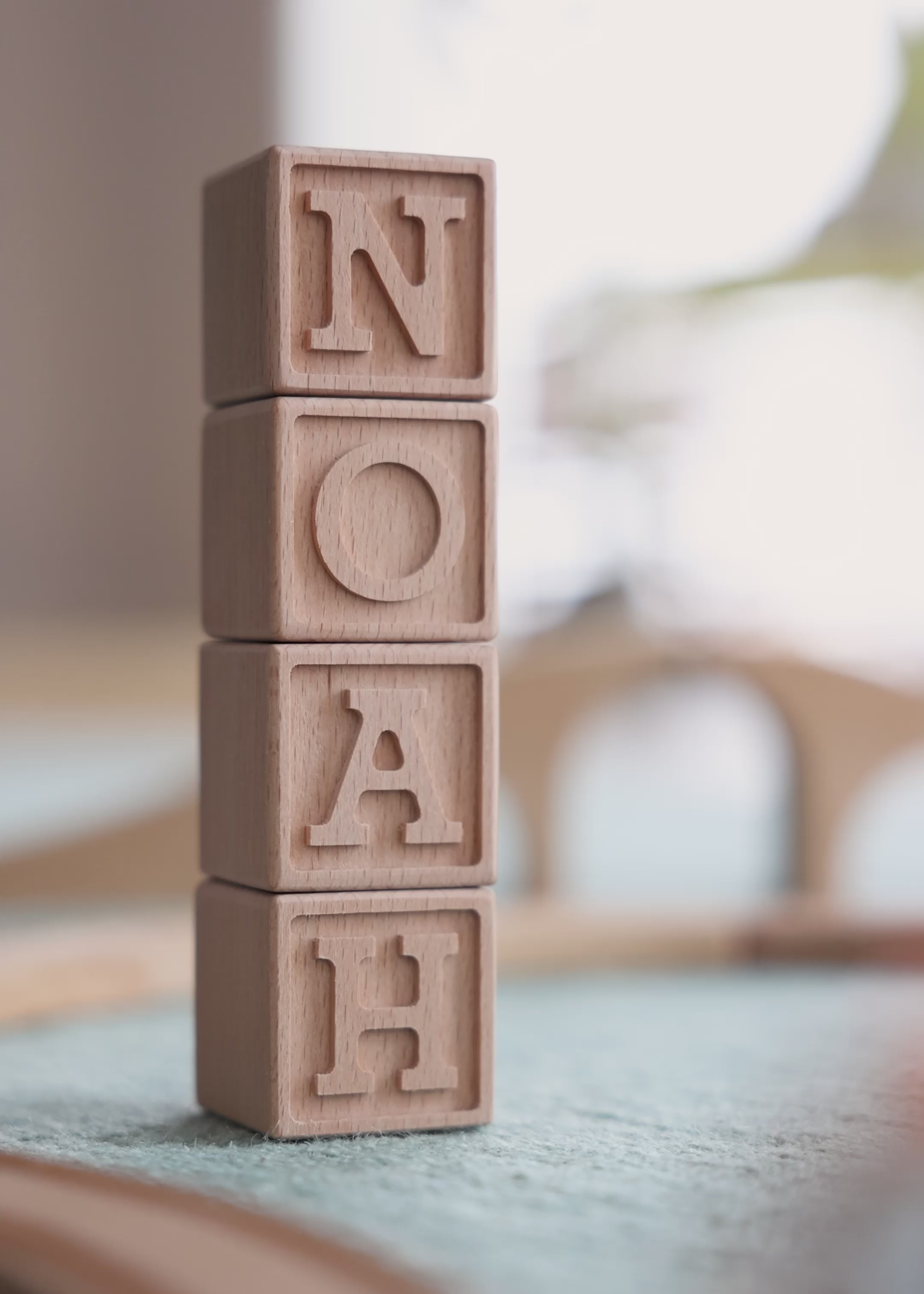Skapa personliga namn i trä med våra små, frästa bokstavsklossar i massivt trä. Ett stilrent uttryck som passar både som leksak (3+) och som dekorativ detalj i barnrum. En tidlös personlig present till barn – perfekt till dop, namngivning och 1-årsdag.